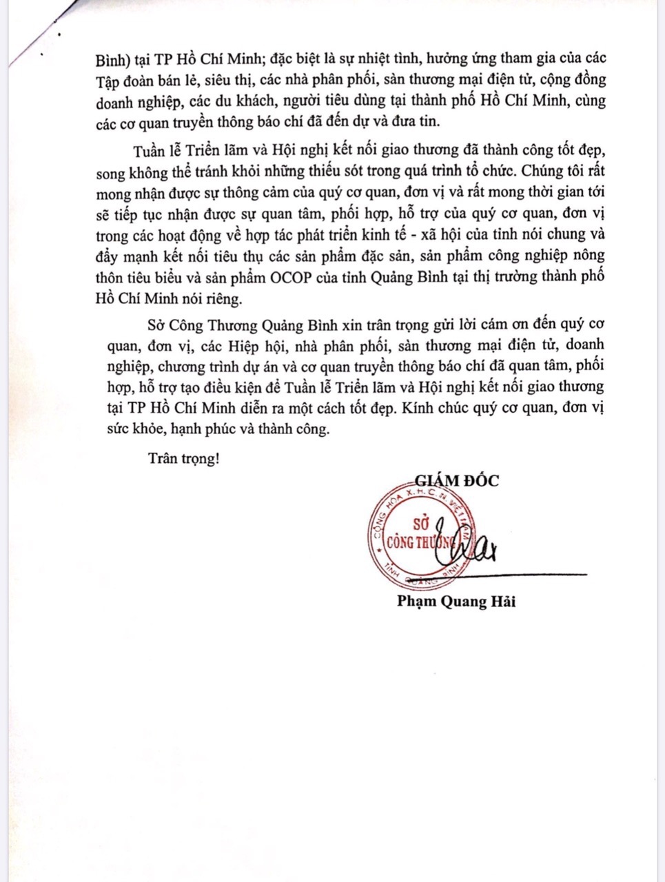 Ghi nhận và tri ân sự đóng góp, tình cảm Ban chấp hành Hội, bà con đồng hương Quảng Bình tại TPHCM, Sở Công thương tỉnh Quảng Bình đã gửi thư cảm ơn Hội đồng hương tỉnh Quảng Bình tại TPHCM và Câu lạc bộ Doanh nhân Nguyễn Hữu Cảnh tại TP HCM nay là Hội Doanh nghiệp Quảng Bình tại TPHCM, các cơ quan Truyền thông, Báo chí.